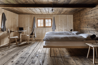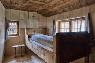 Im Inneren des nun restaurierten Südteils erschliesst der zentrale Quergang im Wohngeschoss Stube und Küche, im darüber liegenden Schlafgeschoss zwei Kammern sowie eine neu ausgebaute Nasszelle und das Schlaflager auf dem Dachboden. In der Stube hat sich eine der wenigen Ausstattungen des 18. Jahrhunderts erhalten, eine kräftig profilierte Balkendecke mit Unterzug, sowie eine in Felder gegliederte Wandvertäfelung entlang der Aussenwände, die aus schmalen Profilleisten und breiten eingenuteten Brettern bestehen. Die Innenwände zum nördlichen Hausteil und zum Flur blieben unverkleidet.