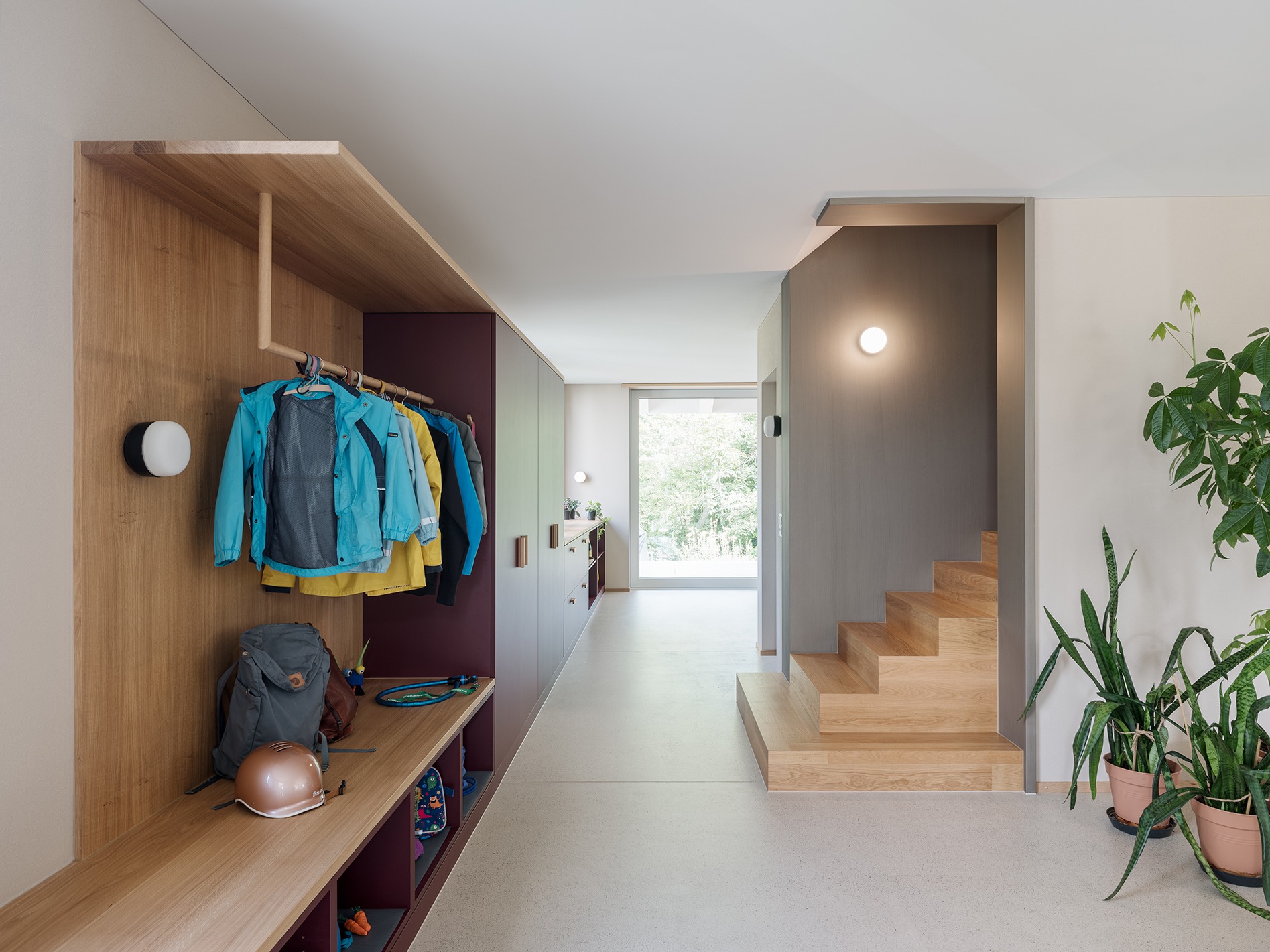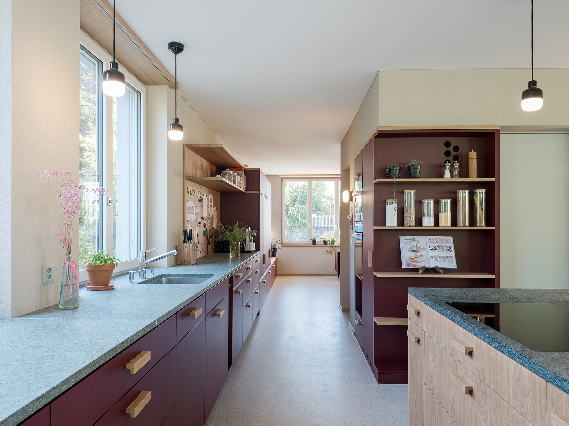 Auch die effiziente Grundrissgestaltung mit kleinen Erschliessungsflächen trägt zur Nachhaltigkeit bei: Das Haus wird direkt über die Veranda betreten. Garderobe, Essen, Kochen, Wohnen sind als offene Raumfolge um einen Kern organisiert und bieten vielfältige Bezüge zum Aussenraum. Im ersten Dachgeschoss befinden sich die Zimmer der Kinder, im zweiten Dachgeschoss die Zimmer der Eltern als private Rückzugsorte. Durch die Kombination von Gauben und Fenstern in den Giebelfassaden sind auch hier alle Räume zweiseitig orientiert und belichtet. Die Materialisierung im Innenausbau setzt auf langlebige, lokal verfügbare und unbehandelte Materialien. Böden und Sitzbänke sind aus geöltem Eichenholz. Zudem wurden Natursteine verwendet: Die Küchenabdeckungen sind aus Andeerer Granit, in den Bädern kam Schiefer zum Einsatz.