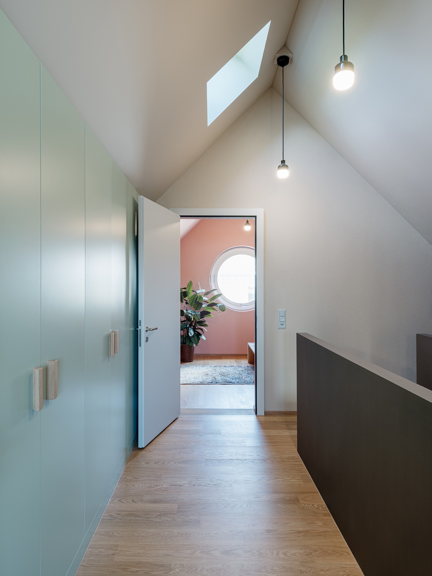 Nicht nur bei der Stromversorgung, sondern auch bei der übrigen Haustechnik kamen zeitgemässe Lösungen zum Einsatz. Erdsonden liefern die Betriebsenergie, und das Haus verfügt über eine kontrollierte Wohnraumlüftung mit Energierückgewinnung. Um die Leitungsführung zu reduzieren, wurde das Lüftungsgerät im 2. Dachgeschoss unterhalb des Kniestocks angeordnet, so dass die Zu- und Abluft direkt über den West- bzw. Ostgiebel angesaugt bzw. ausgeblasen werden kann. Zudem werden Durchdringungen im Dach vermieden. Die gesamte Haustechnik einschliesslich des aussenliegenden Sonnenschutzes kann im Sinne eines Smart Home intelligent gesteuert werden.