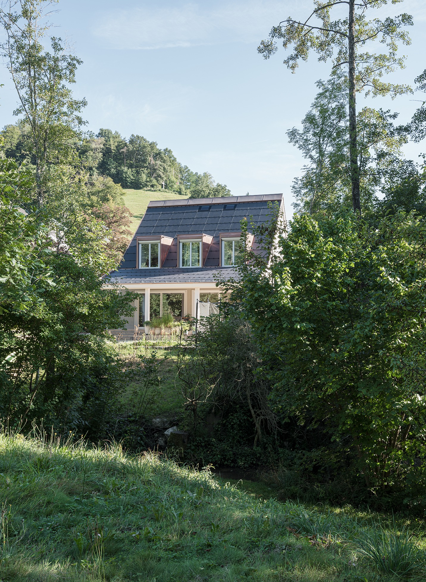 Das langgestreckte Grundstück erstreckt sich zwischen der Strasse und einem Waldrand. Die Architekten haben diese Besonderheit bei der Positionierung des Neubaus berücksichtigt und ihn in der Mitte des Grundstücks platziert. Der Vorgarten bildet die Adresse und ist mit einem freistehenden Carport leicht zoniert, der Hintergarten bildet den Übergang zum Waldrand und zum Bach. Gegenüber der Nachbarbebauung ist der Neubau leicht zurückgesetzt. Dadurch entsteht eine selbstverständliche ortsbauliche Situation. Die Charakteristik der Strassenräume wird aufgenommen und weitergeführt.