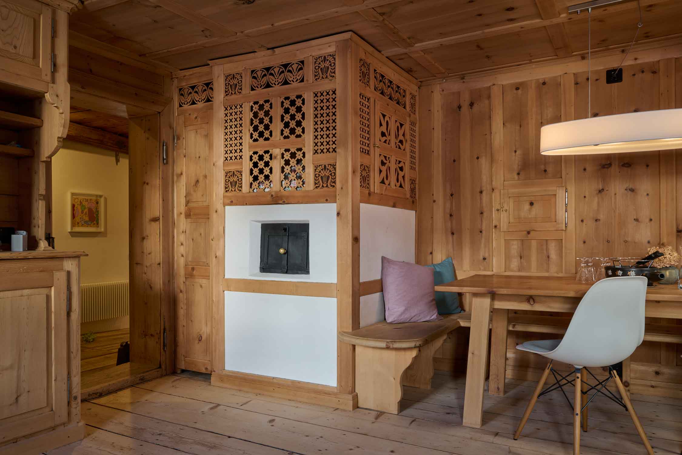 Die Konstruktion des Engadiner Wohnstallhauses ist einzigartig. Das Innere des Wohnteils ist ein zum Schutz vor Dorfbränden, aber auch zur Isolation und wohl auch zu Repräsentationszwecken ummauerter Strickbau. Kleine Fenster verhindern Wärmeverluste. Das Rundbogentor als Eingang musste gross genug für Pferd und Wagen sein. Über den überdachten Sulér (Hausflur im Erdgeschoss) gelangte man trockenen Fusses in die rückwärtig integrierte Stallscheune. Der Stall bzw. der Heuboden war nach Süden ausgerichtet, damit das Heu gut trocknen konnte. Die Luftschlitze im offenen Stallbau sorgten für eine gute Durchlüftung.