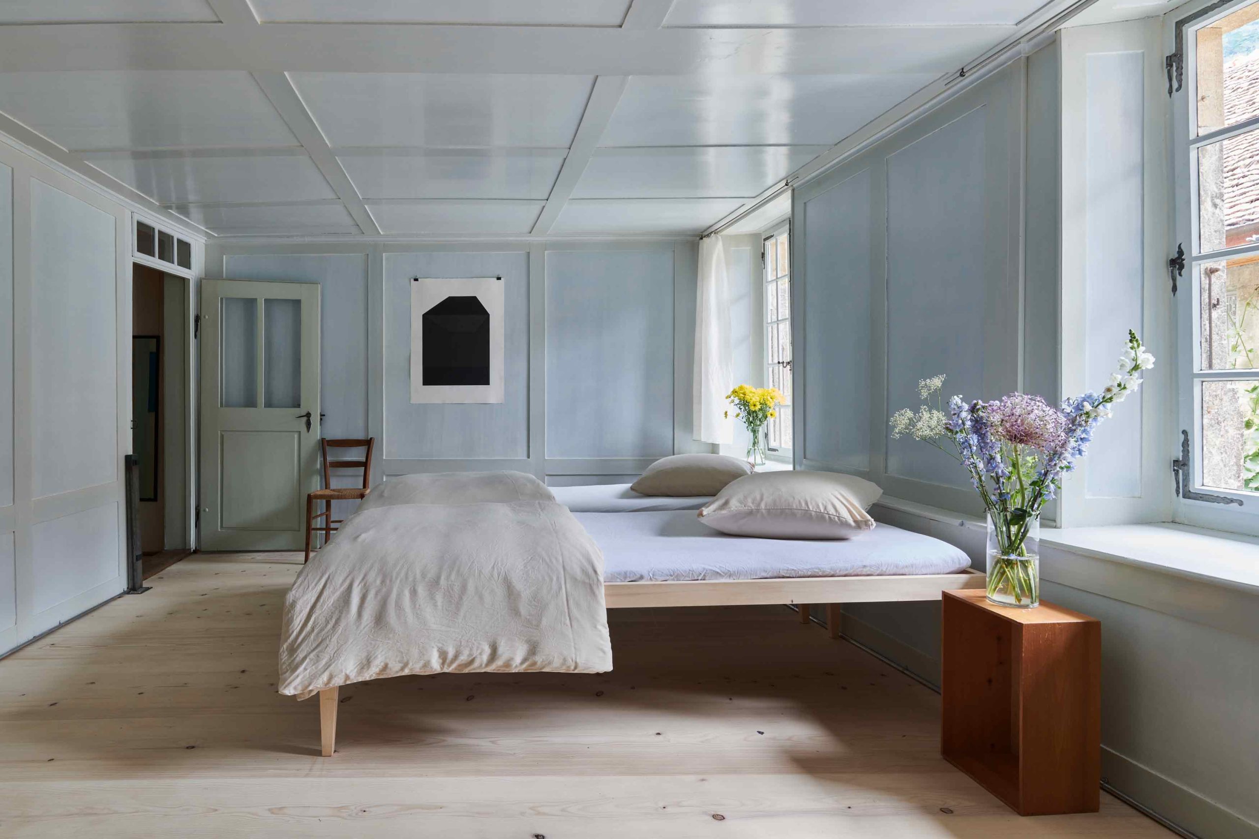 Nun öffnet das Rebarbeiterhaus in Twann als zweites Baudenkmal am Bielersee seine Türen und heisst bis zu vier Gäste willkommen. Von der grosszügigen Wohnküche gelangt man in den kleinen Hinterhof mit Sitzgelegenheit und plätscherndem Wasser aus dem Sodbrunnen. Das unkonventionelle Badezimmer hat eine Papiertüre, die von der Künstlerin Salome Lippuner mit einem speziellen japanischen Lack bearbeitet wurde. Der Fussboden wurde mit Asphalt aus dem Val de Travers gegossen. Die Wände sind wiederum in Kalk getüncht. Die Stube und das darüberliegende Schlafzimmer zieren Kachelöfen. Um das Gebäude und die Wände möglichst nicht zu tangieren, wurden die elektrischen Installationen in freistehende Stelen eingebaut.Gleichzeitig ist der Bielersee mit Badewiese und Schiffsteg ist nur wenige Fussminuten entfernt.