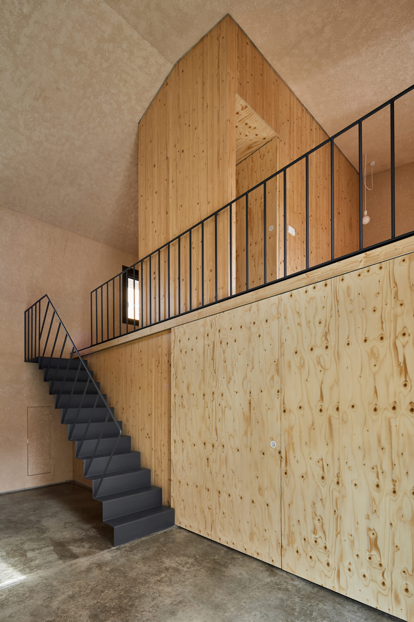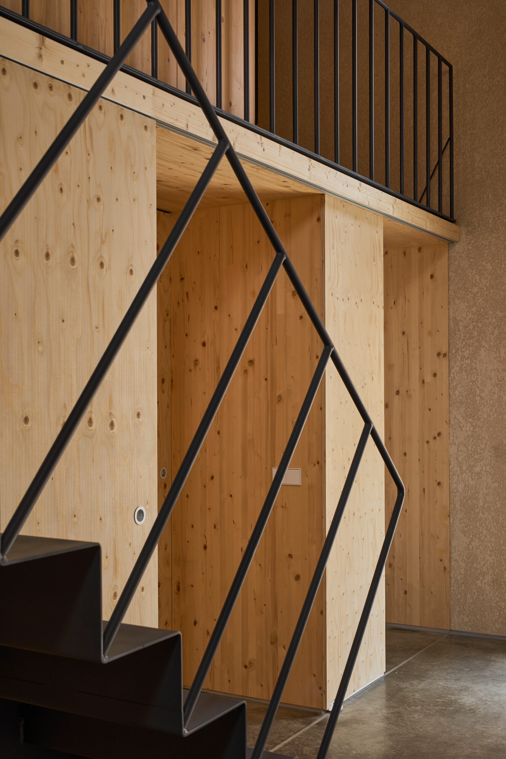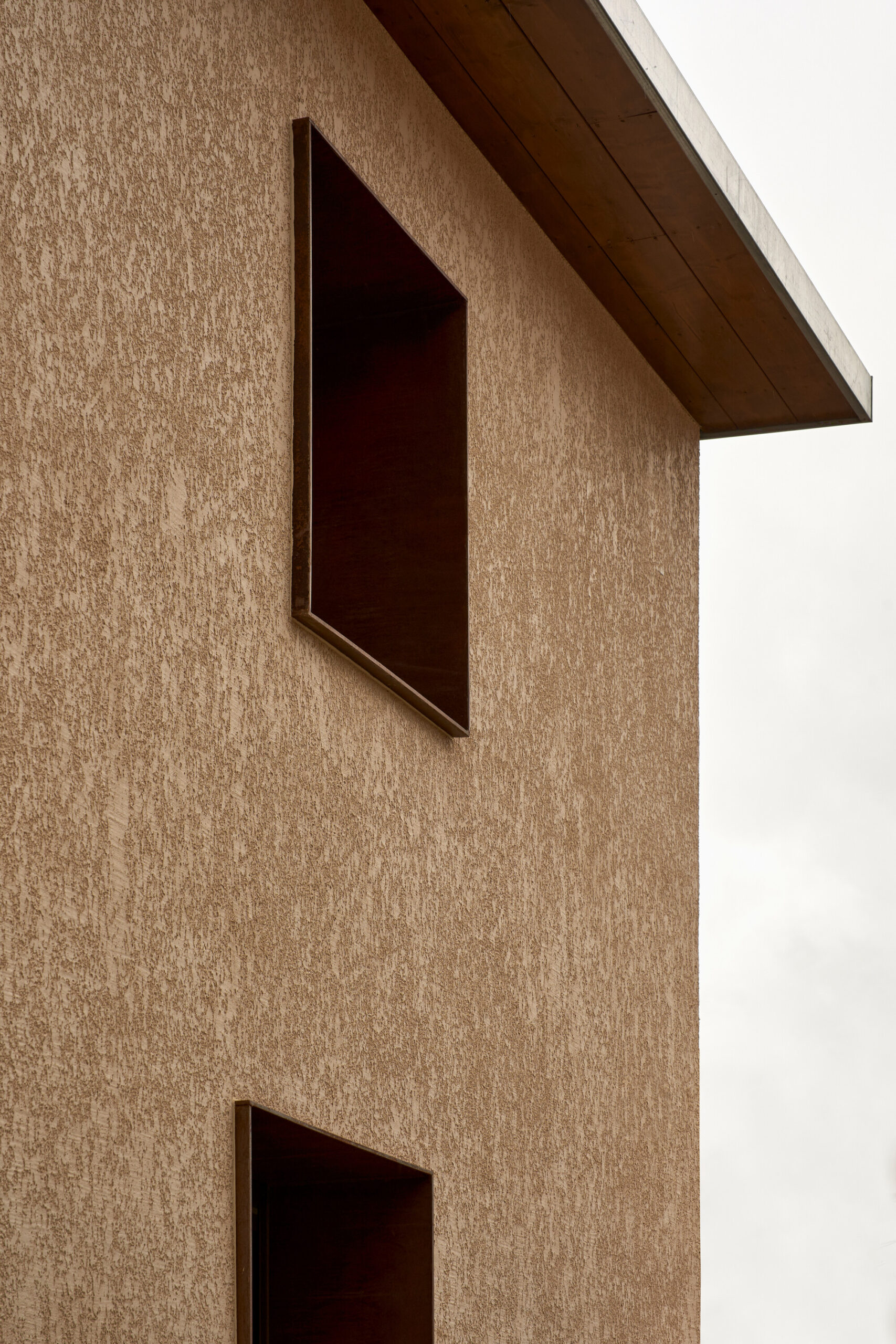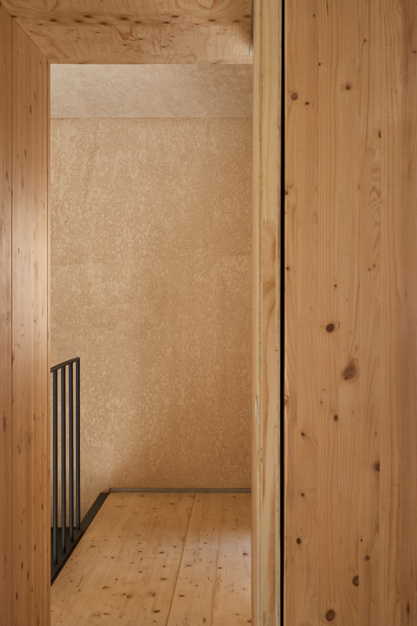 Auch technisch folgt das Projekt einem klaren Konzept. Eine durchgehende Dämmschicht an der Innenseite der Gebäudehülle sorgt für energetische Effizienz. Eine leichte Vorsatzschale erlaubt die Verwendung desselben Einlagenmörtels wie an der Fassade – für thermische Kontinuität und materielle Kohärenz. Das Dach wurde vollständig erneuert. Die traditionelle Balken- und Sparrenstruktur bleibt in ihrer Logik erhalten, wird jedoch in Brettschichtholz ausgeführt, um höchste Präzision und strukturelle Stabilität zu gewährleisten. Die vorgefertigte Holzbox wurde von einem lokalen Unternehmen in Modulen produziert. Dies stärkt die Verbindung zum regionalen Handwerk und reduziert gleichzeitig Transportaufwand und Umweltbelastung.