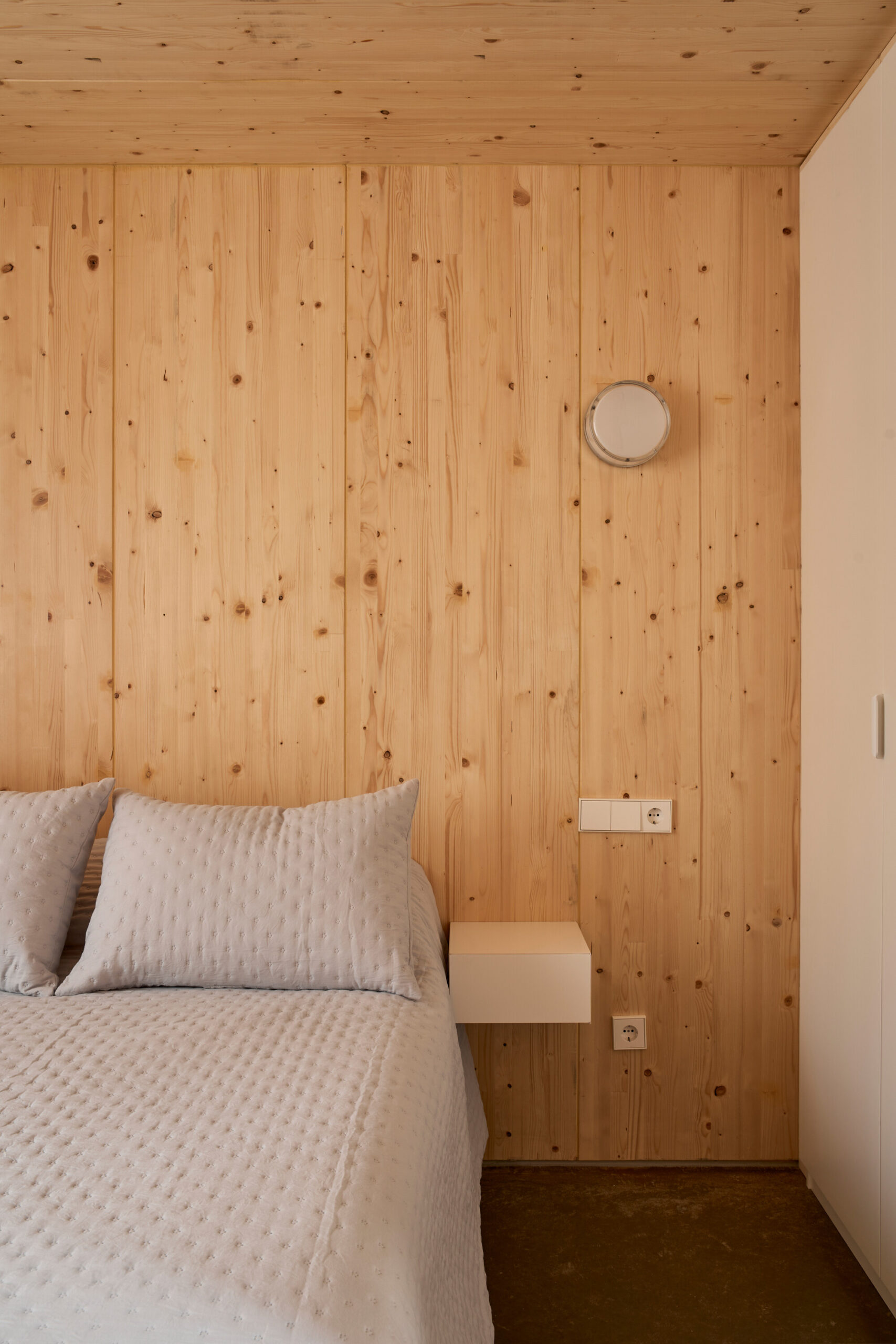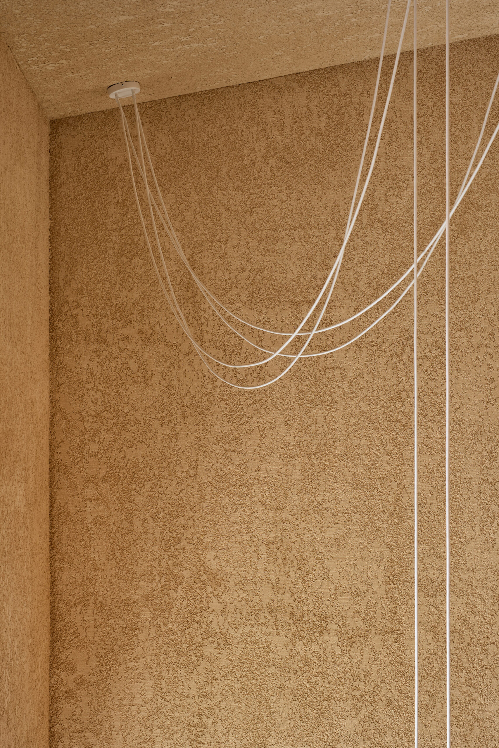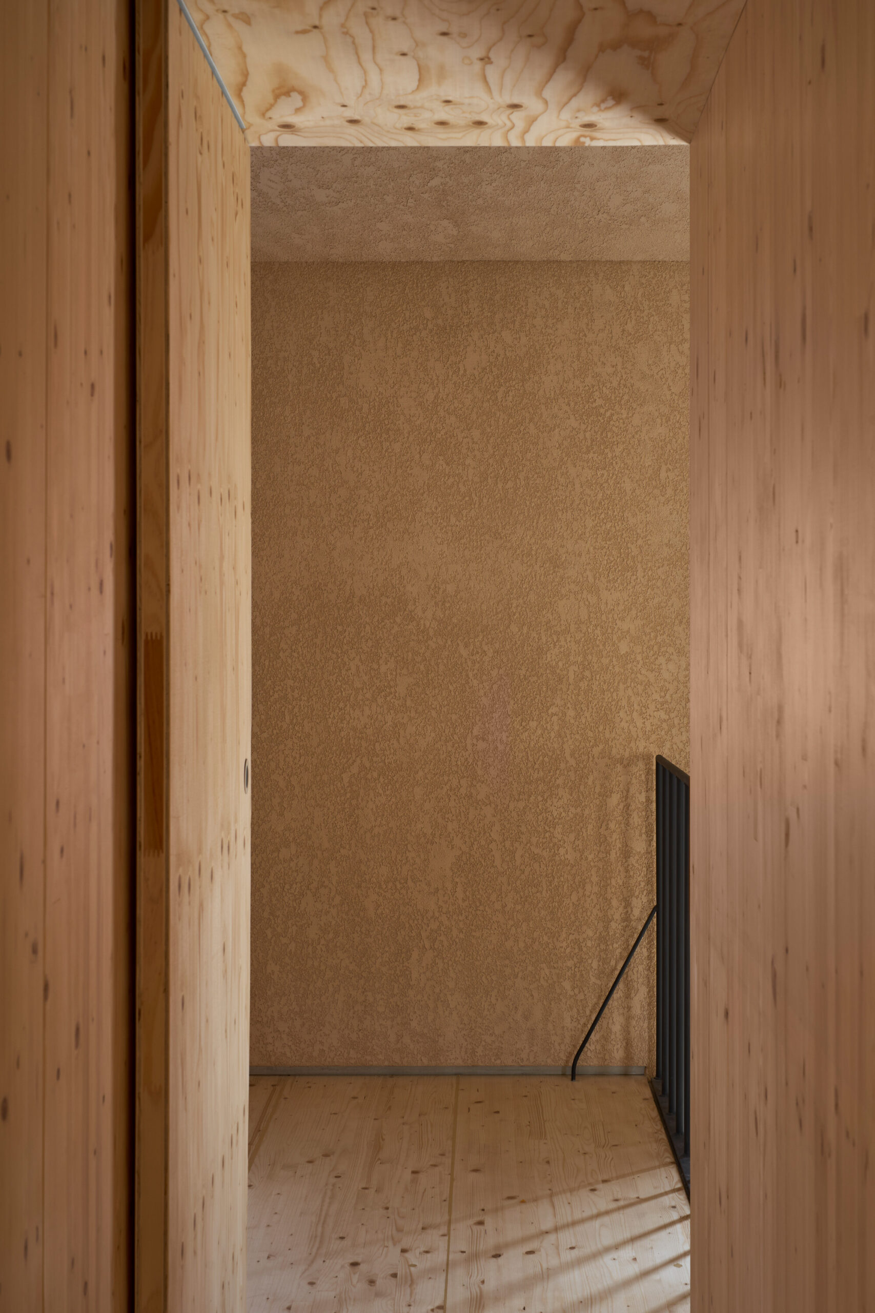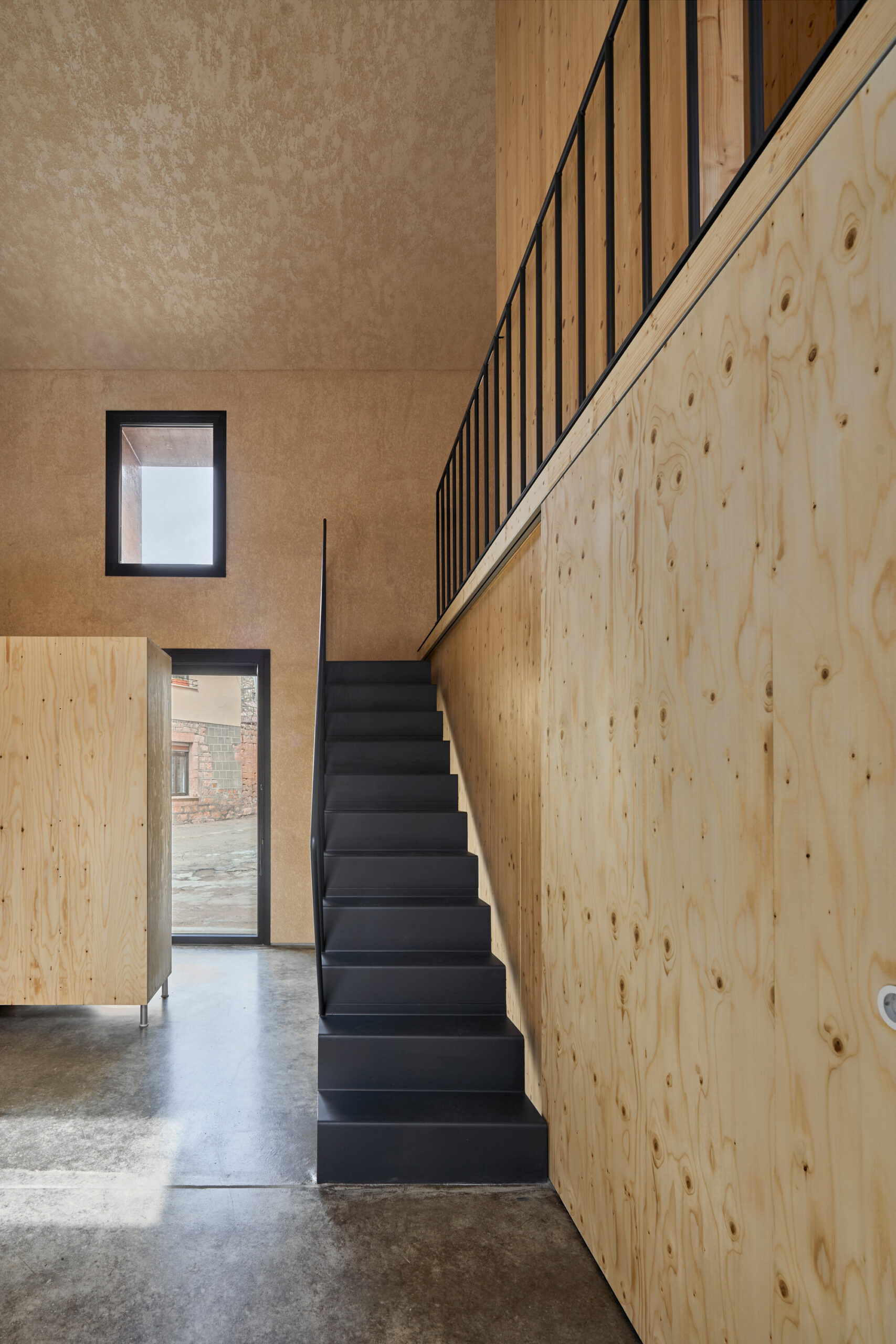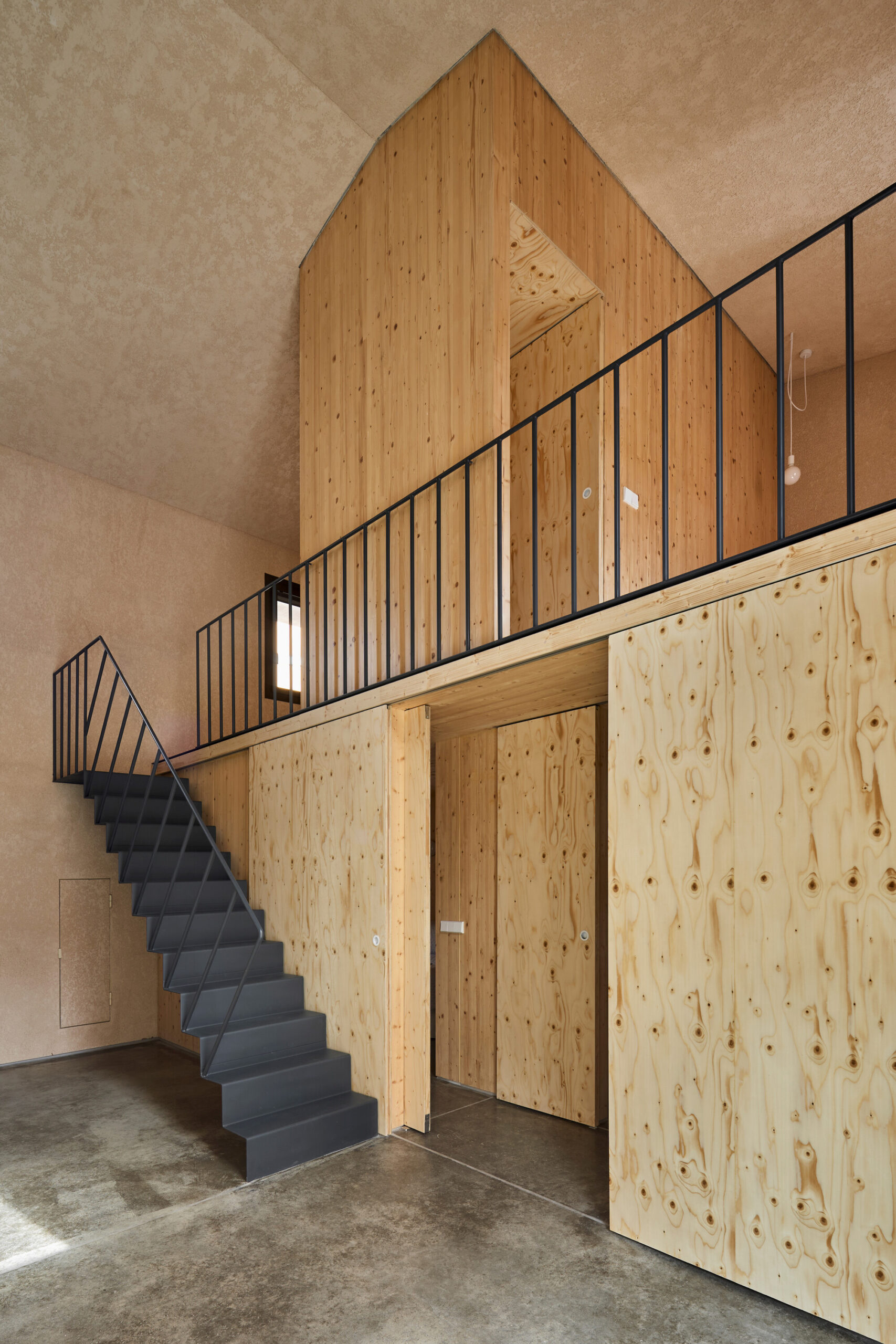Auch technisch folgt das Projekt einem klaren Konzept. Eine durchgehende Dämmschicht an der Innenseite der Gebäudehülle sorgt für energetische Effizienz. Eine leichte Vorsatzschale erlaubt die Verwendung desselben Einlagenmörtels wie an der Fassade – für thermische Kontinuität und materielle Kohärenz. Das Dach wurde vollständig erneuert. Die traditionelle Balken- und Sparrenstruktur bleibt in ihrer Logik erhalten, wird jedoch in Brettschichtholz ausgeführt, um höchste Präzision und strukturelle Stabilität zu gewährleisten. Die vorgefertigte Holzbox wurde von einem lokalen Unternehmen in Modulen produziert. Dies stärkt die Verbindung zum regionalen Handwerk und reduziert gleichzeitig Transportaufwand und Umweltbelastung.
