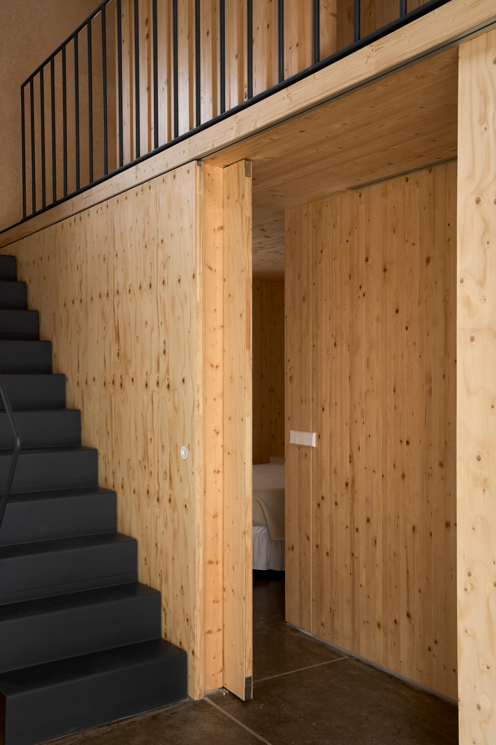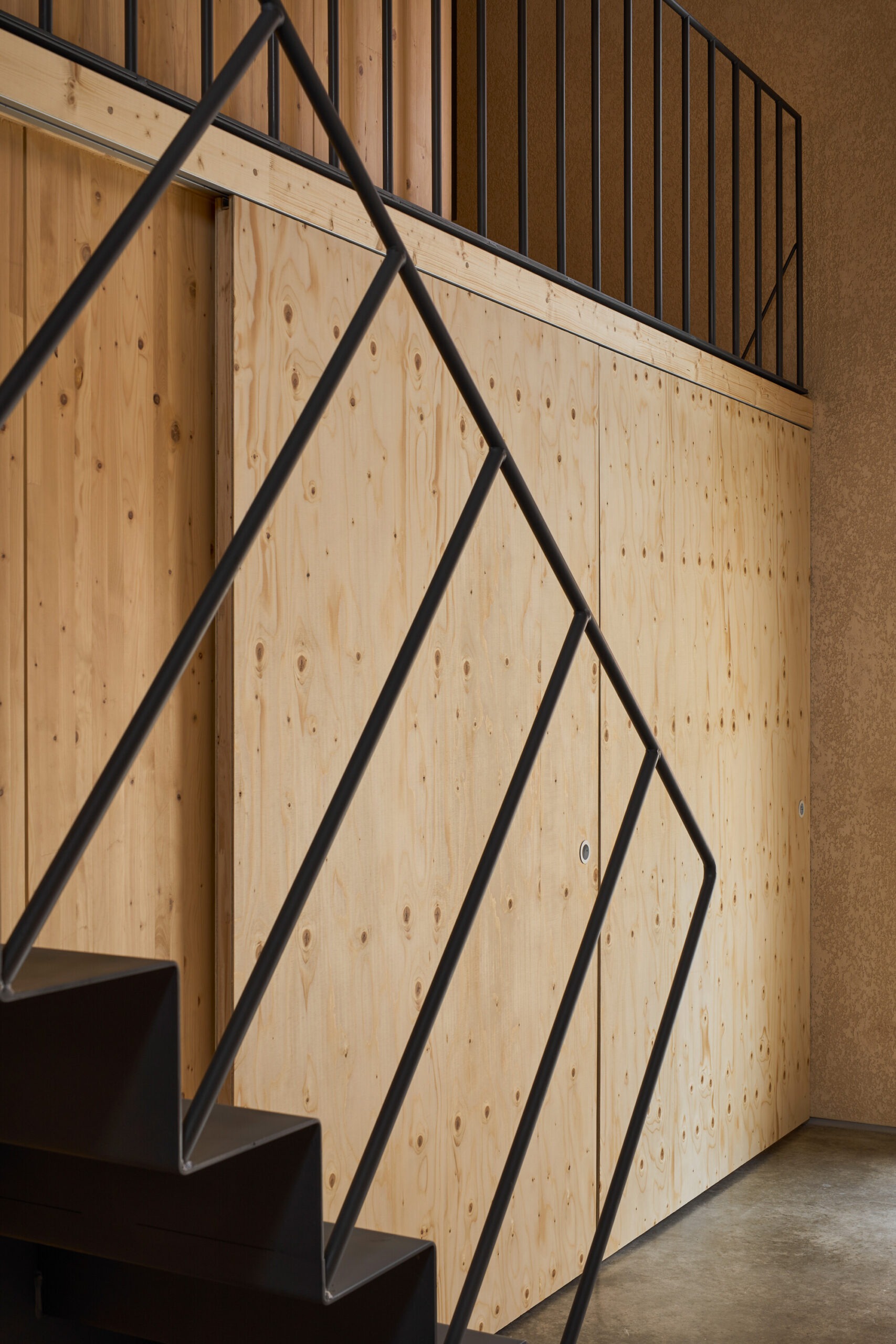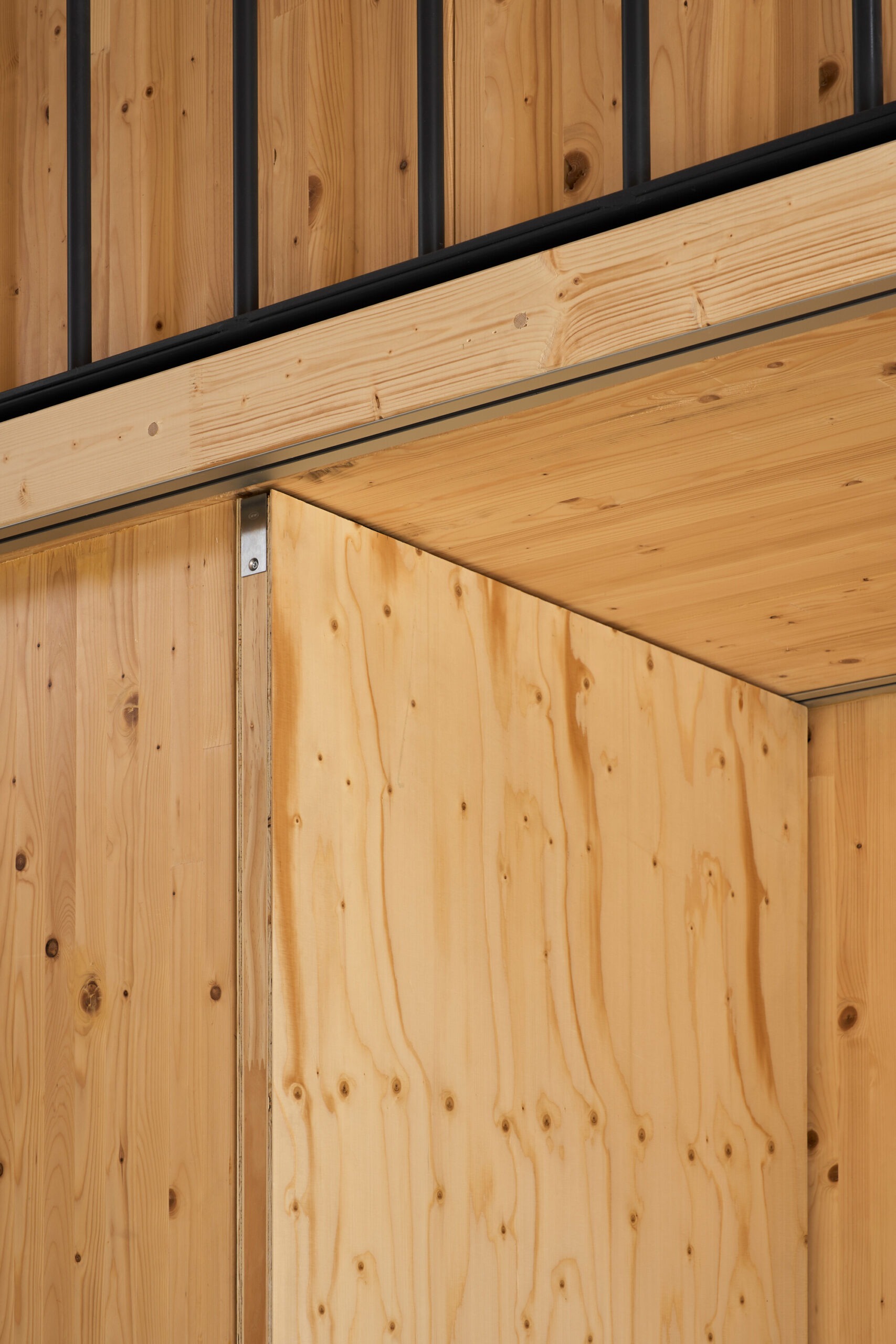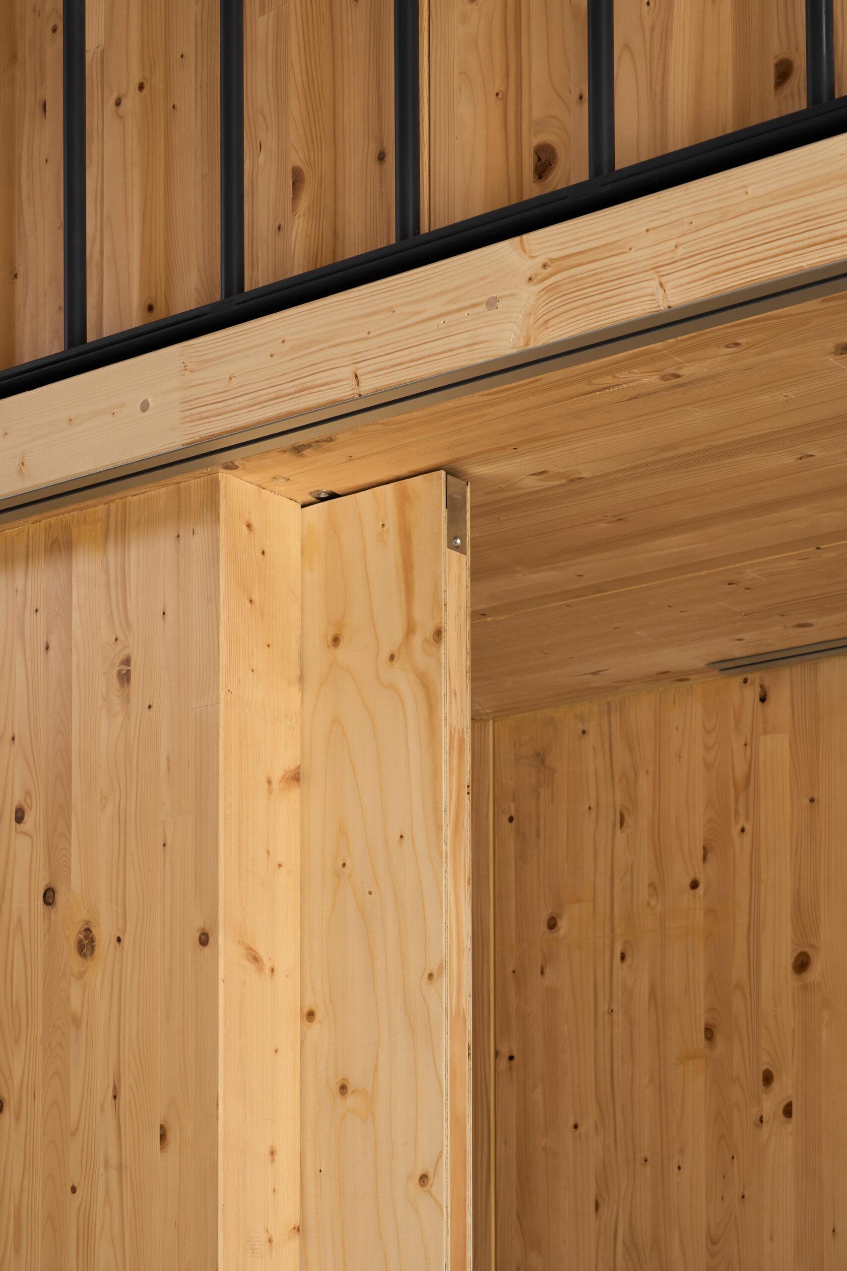 In das historische Mauerwerk wurde eine eigenständige Konstruktion aus Brettschichtholz eingefügt – eine klar definierte „Holzbox“, die etwa die Hälfte des vorhandenen Volumens einnimmt. Teilweise an die Bestandswände angelehnt, entsteht ein spannungsreicher Dialog zwischen Alt und Neu, zwischen rauer Materialität und warmer Holzoberfläche, zwischen Massivität und Leichtigkeit. Die Positionierung der Box lässt den Raum „atmen“ und erzeugt vielschichtige räumliche Beziehungen zwischen der erhaltenen Hülle und dem neuen Kern. Grosszügige Schiebe- und Drehtüren aus demselben Holz wie die Tragstruktur ermöglichen flexible Raumkonfigurationen und schaffen sowohl visuelle als auch funktionale Offenheit.